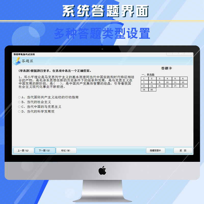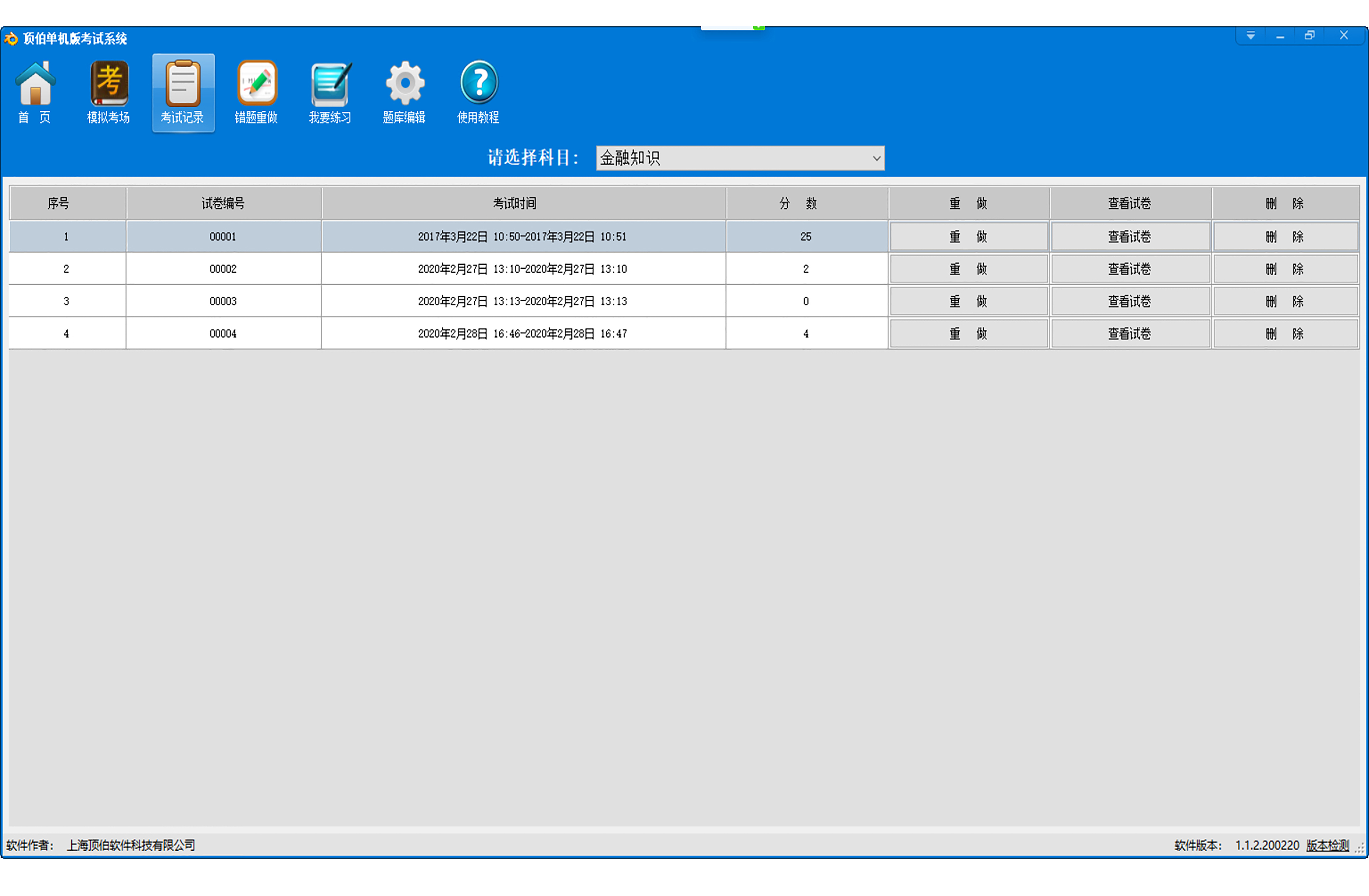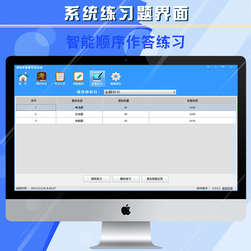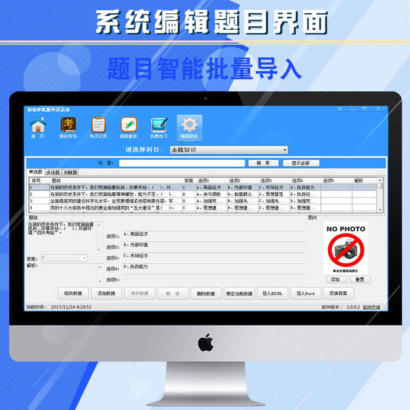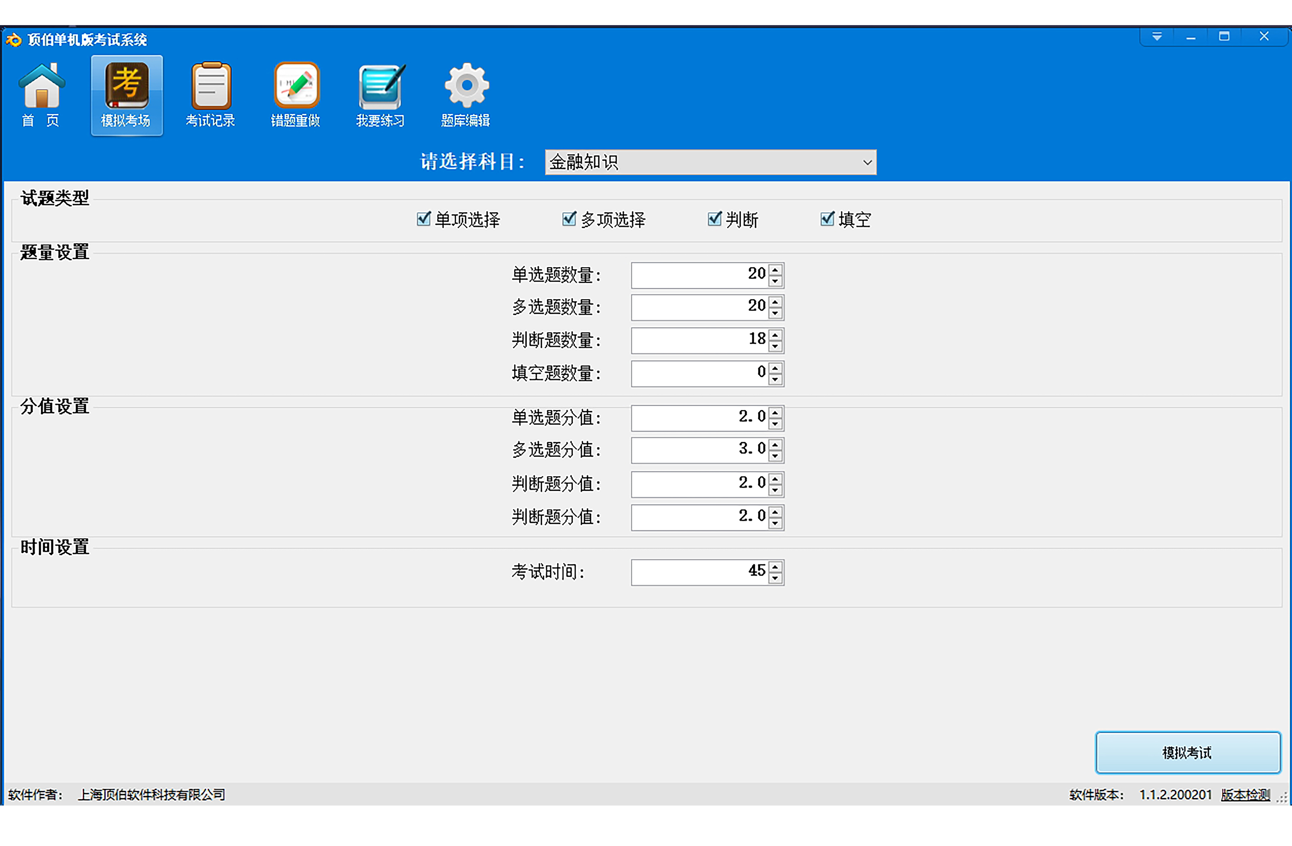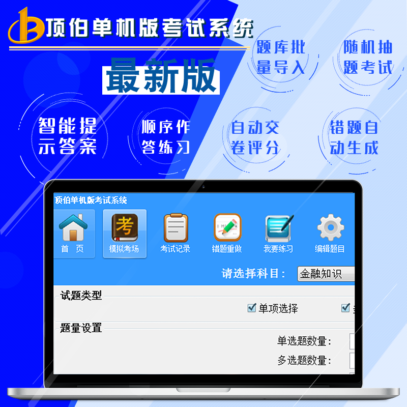顶伯单机版考试系统功能强大,界面美观,用户可自行编辑题库,并可批量导入WORD、EXCEL及TXT文档,支持模拟考试、错题汇总、题目顺序练习、随机练习等功能,操作使用方便。