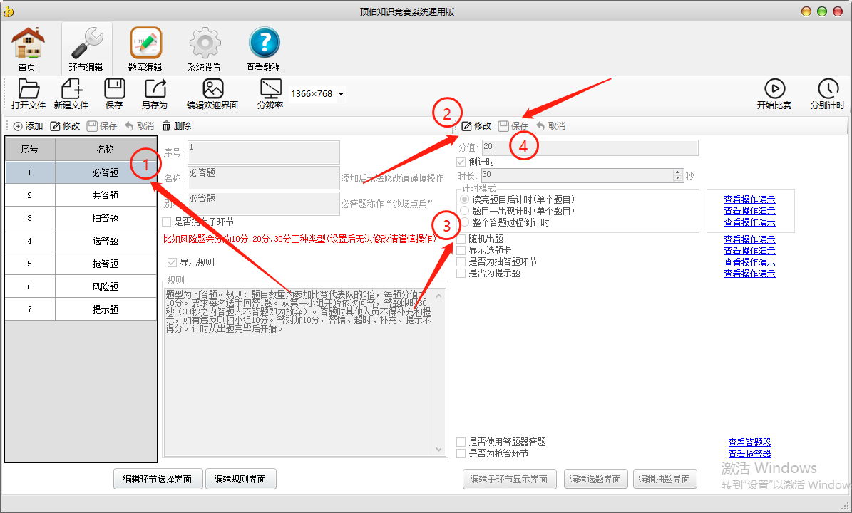 1、在环节编辑界面选中需要将出题模式修改为随机出题的环节;