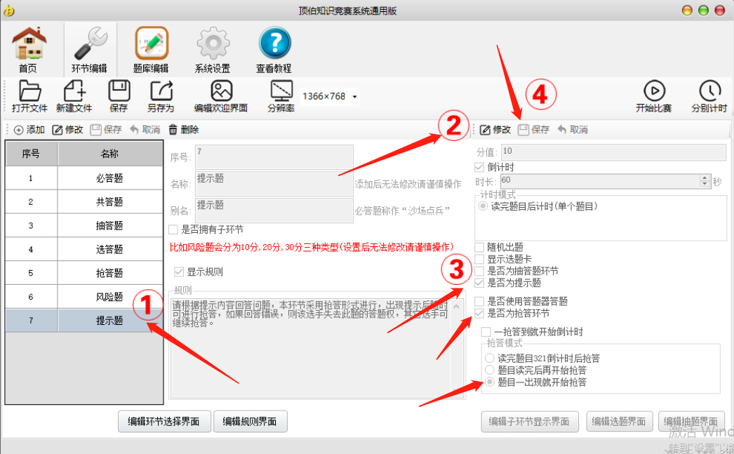 3、把是否为提示题复选框前的对勾打上;在是否为抢答环节复选框上打上对勾;选择抢答模式为题目一出现就开始抢答;