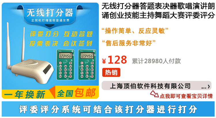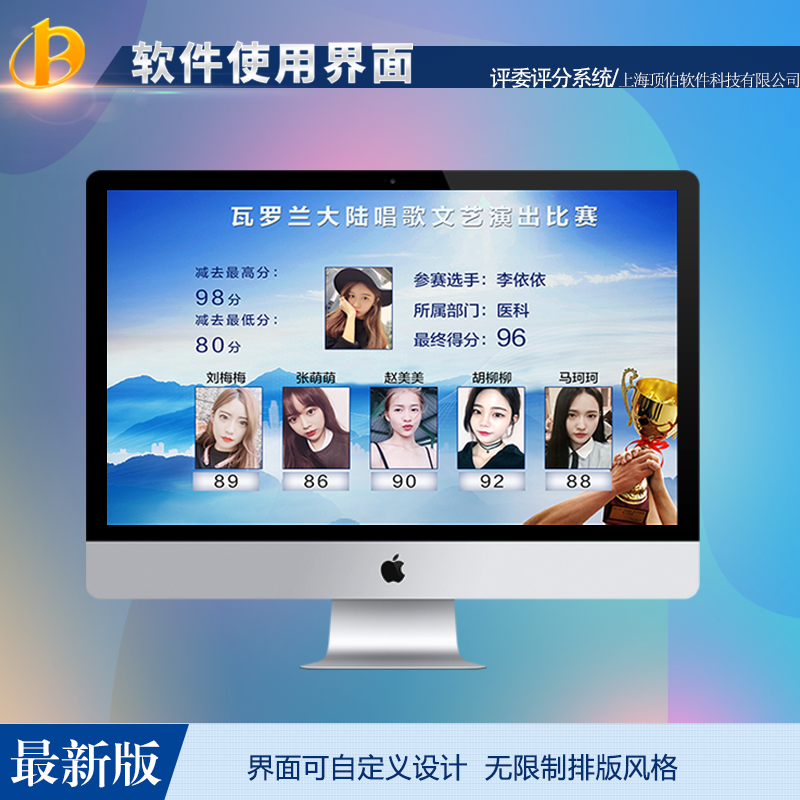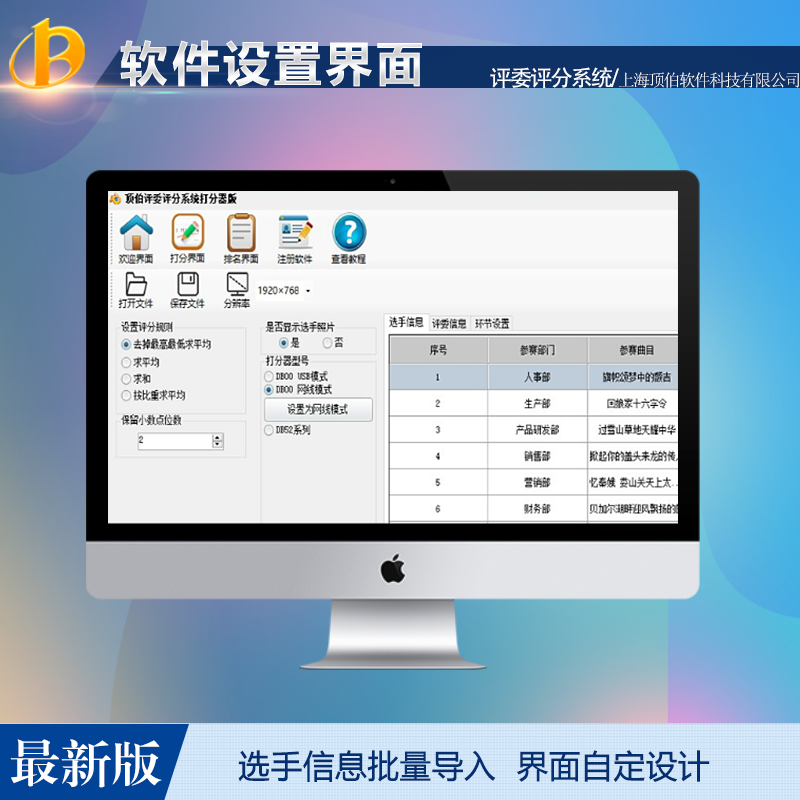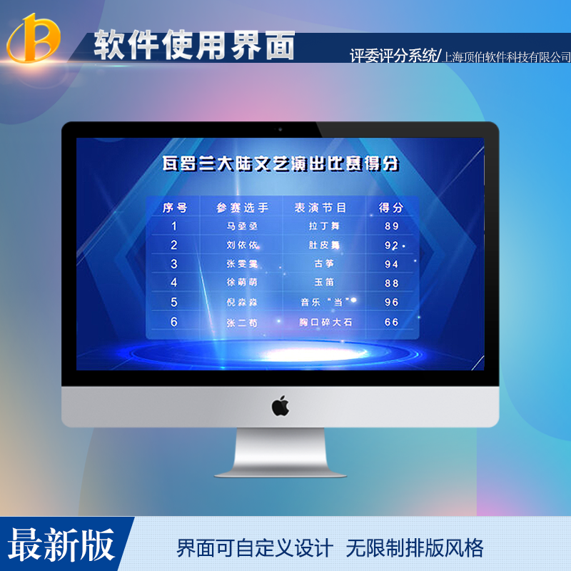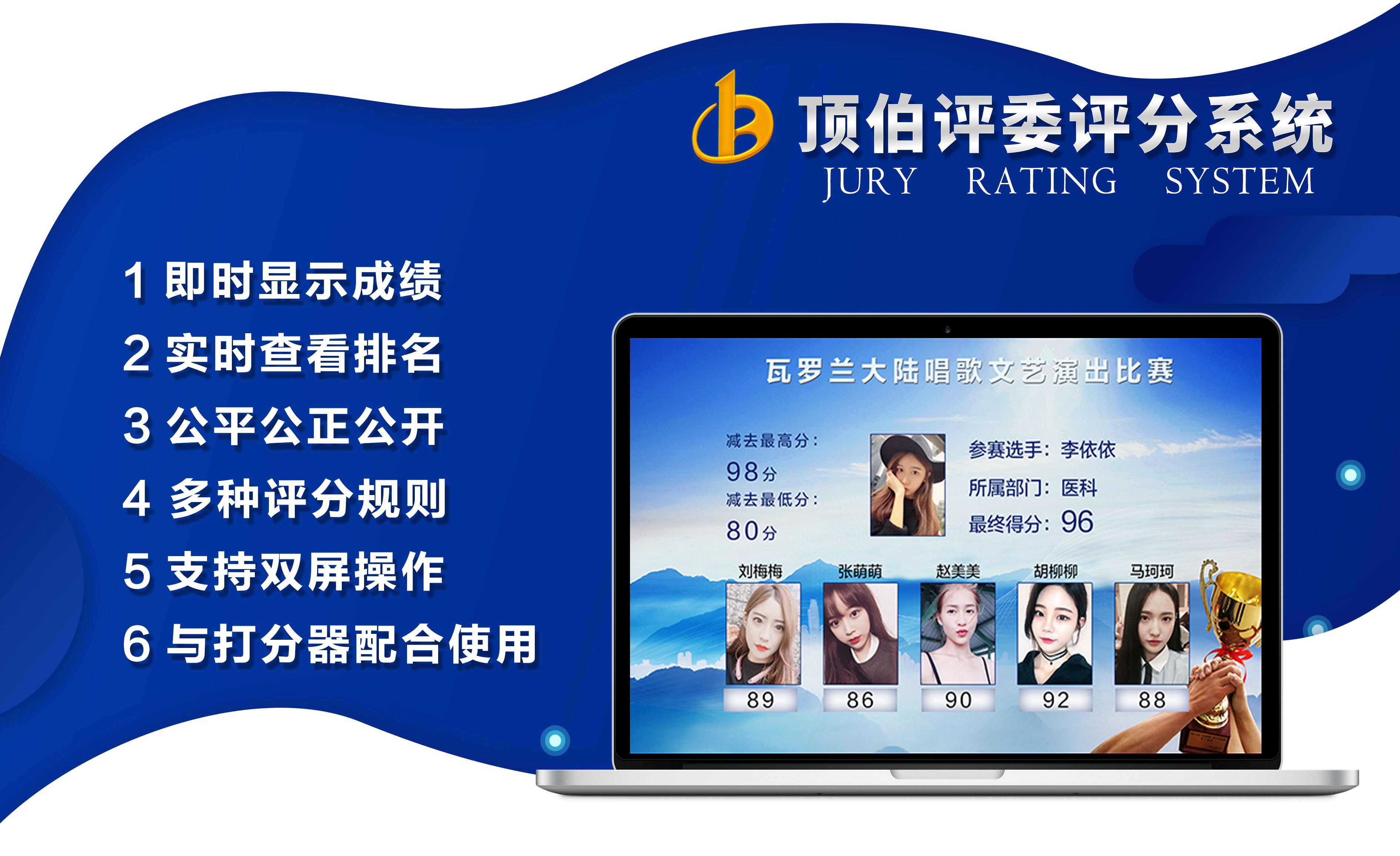 顶伯评委评分系统主要用于企事业单位、学校、娱乐行业等组织的演讲、歌唱、诗歌朗诵等评委打分竞赛活动。操作简单,使用方便。比赛数据可自行编辑,自行导入;所有界面元素样式均可自行设计;支持双屏操作,支持多种评分规则。