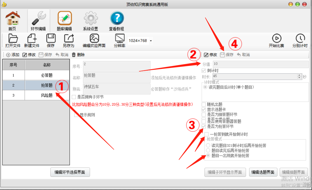 1、在环节编辑界面选中需要将出题模式修改为抢答模式的环节;