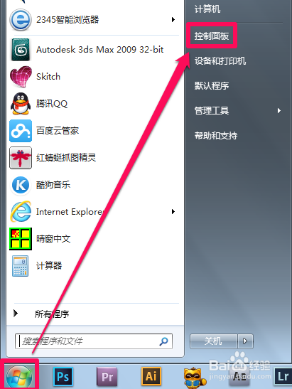 1、首先点击左下角的开始按钮,然后点击控制面板。