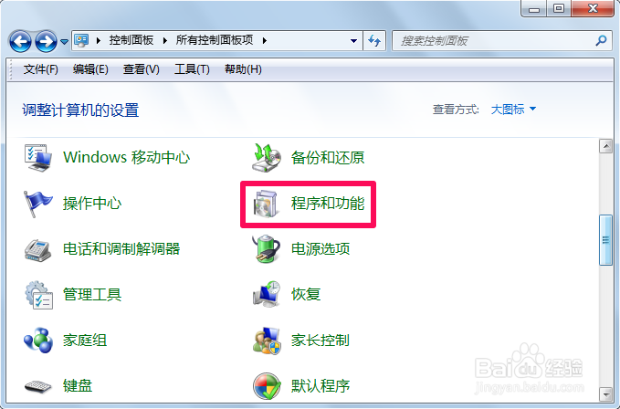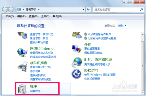 2、在控制面板中点击卸载程序,如果你右上角的查看方式是类别,第一张图片就是卸载程序的位置;如果你的查看方式是大图标,那么程序和功能在第二张图的位置。