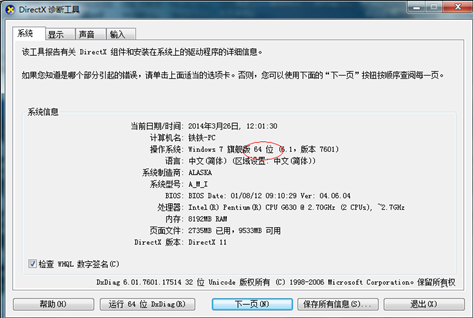 在【开始】--【运行】中输入:dxdiag,将出现如下界面: