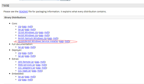 在下载页面,选择 【32-bit/64-bit Windows Service Installer】,此为TOMCAT安装版,适合服务器上安装使用,如下图所示: