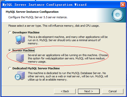 如果在服务器上安装,此处选择【Server Machine】(【服务器机】),选择作为服务器机可以大大提高数据库性能,但会增加内存消耗。