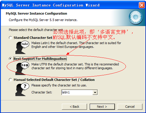 字符编码设置,此步非常重要。中文为非标准字符集(按照西方偏见标准,MYSQL默认支持字符集为ISO 8859-1),请一定要选择第二项【Best Support For Multilingualism】(对多语言的最优支持)。否则将出现中文乱码,您的系统中的中文将直接变为天书。