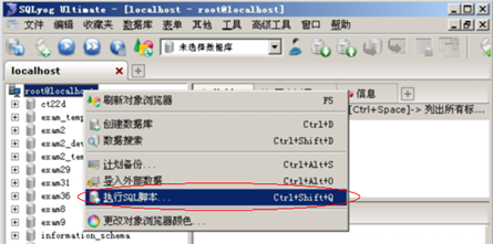MYSQL、SQLYOG都安装完成后,要导入数据库,导入方法如下:进入SQLYOG,在左侧localhost上点右键,在弹出式菜单中选【执行SQL脚本】,如下图所示: