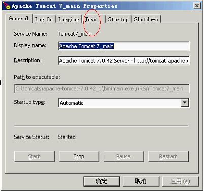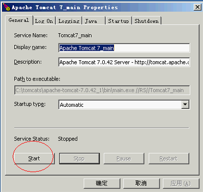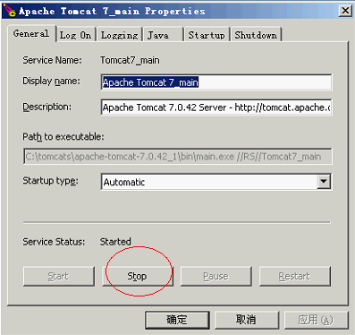 参数正确录入完成后要重启TOMCAT服务器,方法为先点击【General】页面的【Stop】。