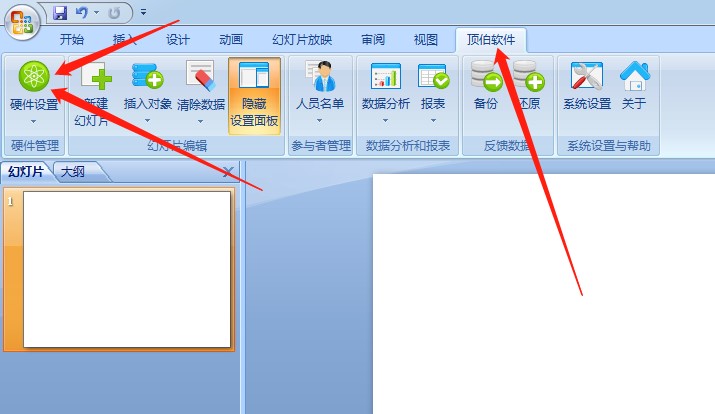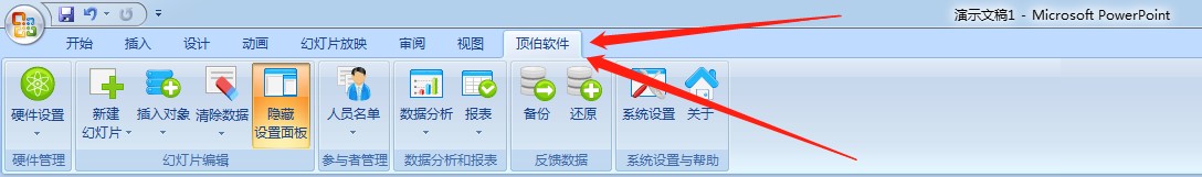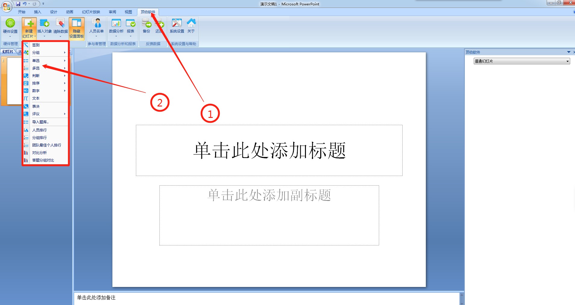 三、系统制作:双击打开顶伯软件图标打开软件,点击软件上的 eq \o\ac(○,1)1处进入系统,点击 eq \o\ac(○,2)2处开始制作PPT