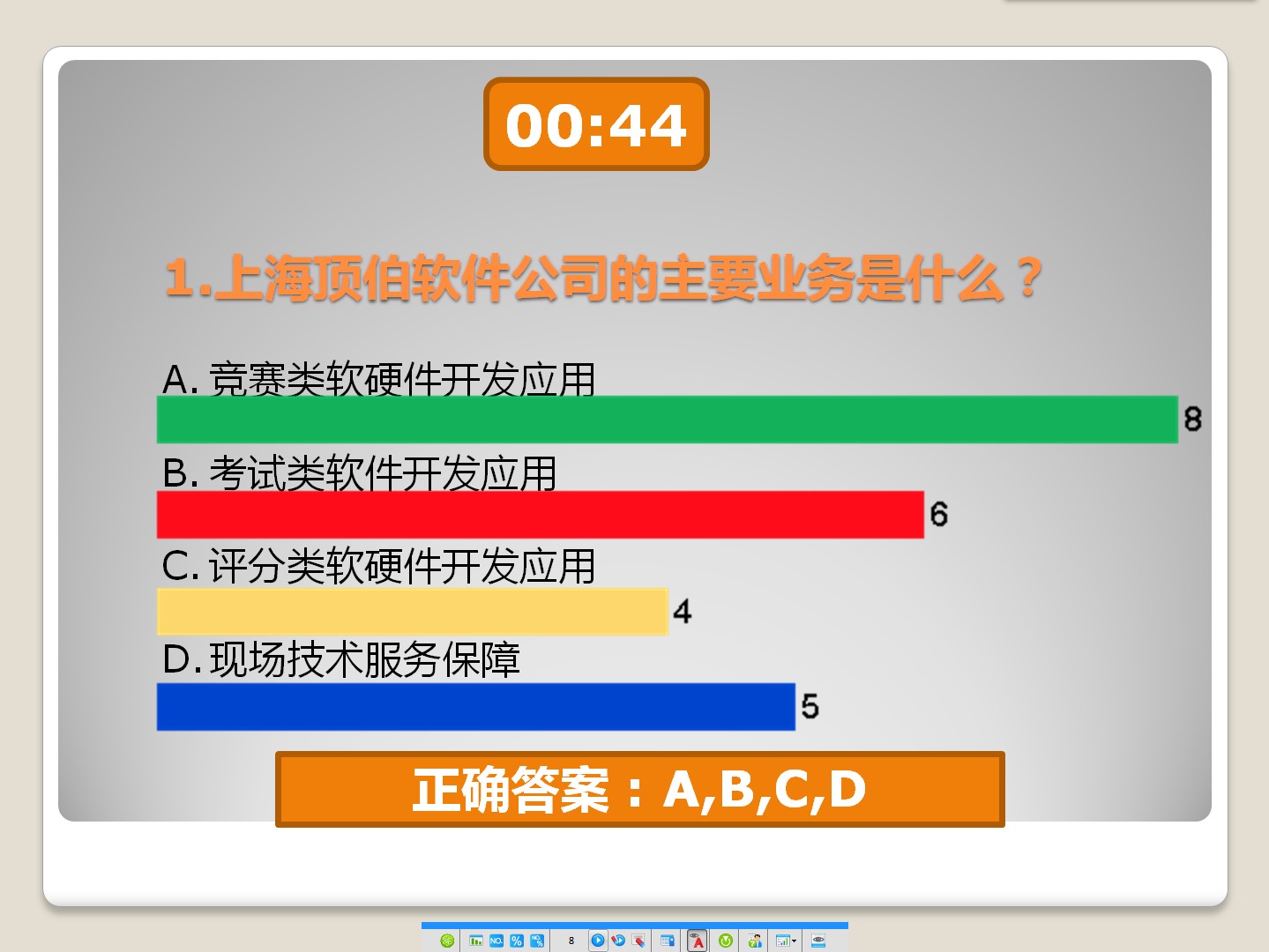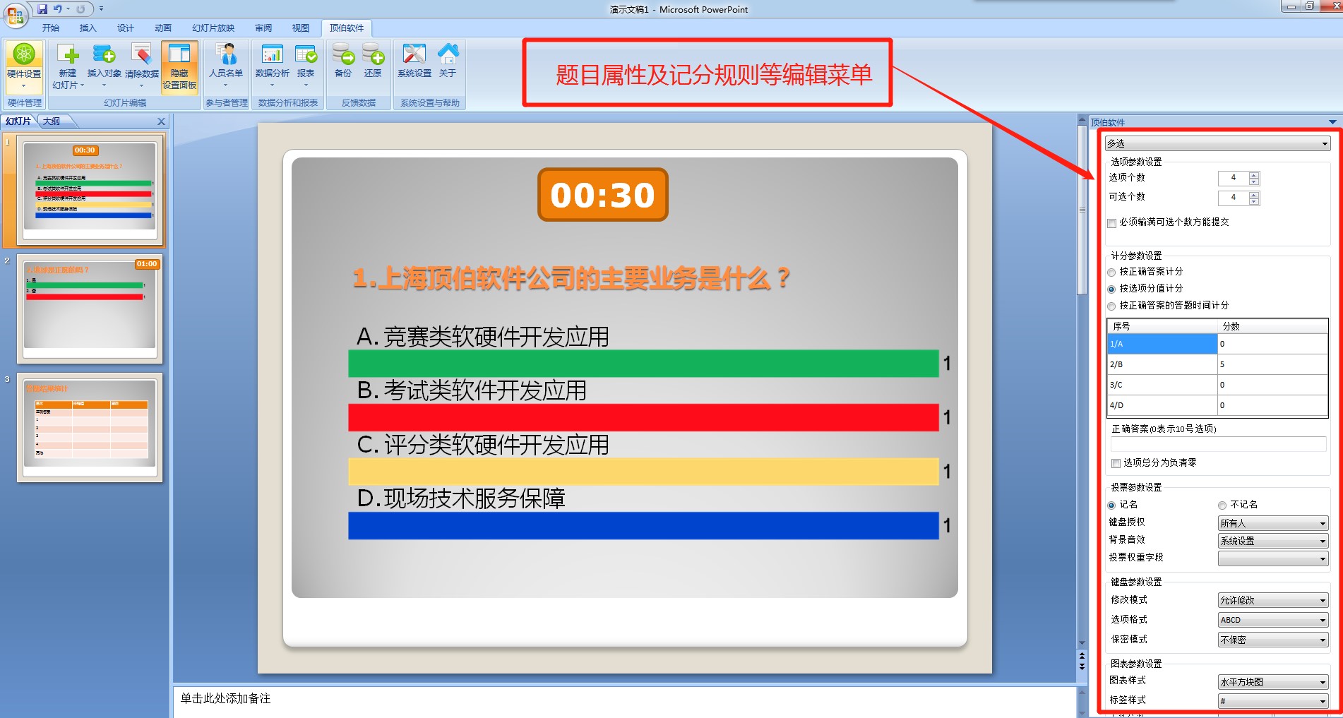 2.题目显示界面:做好题目后点击PPT播放按钮,在题目显示界面最下方通过控制按钮控制作答、显示作答数据等