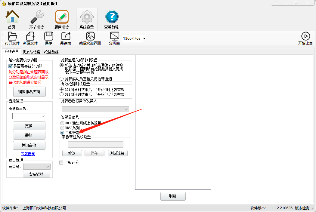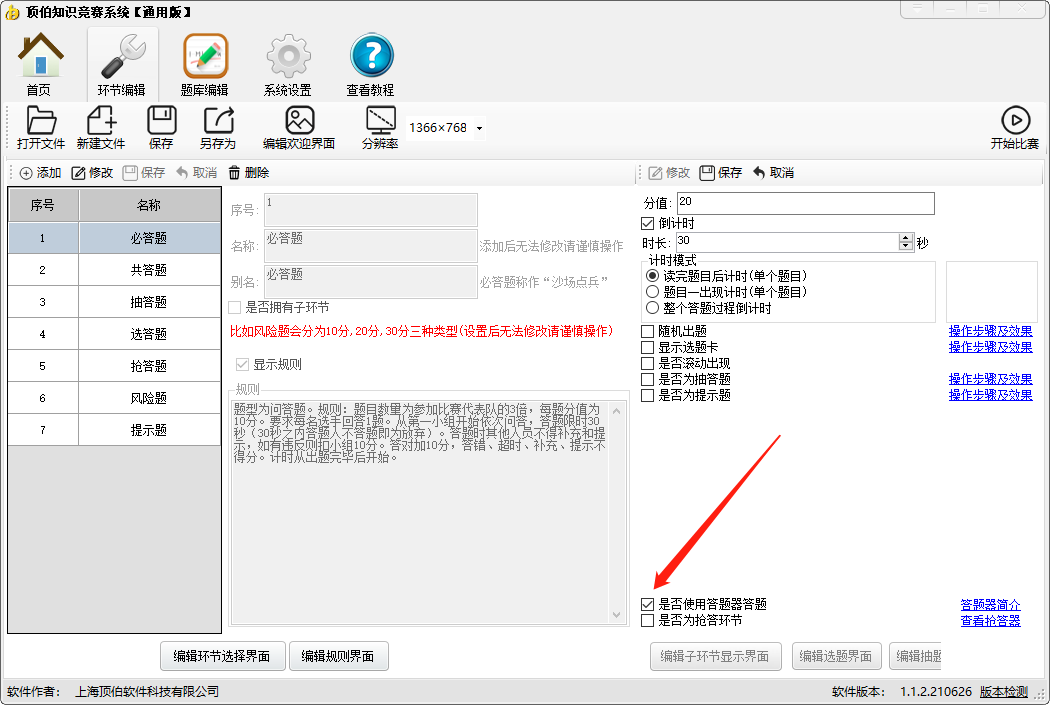 打开顶伯知识竞赛软件,选择环节编辑---至少有一个环节要勾选用答题器答题,如下图所示;