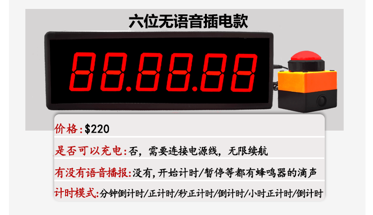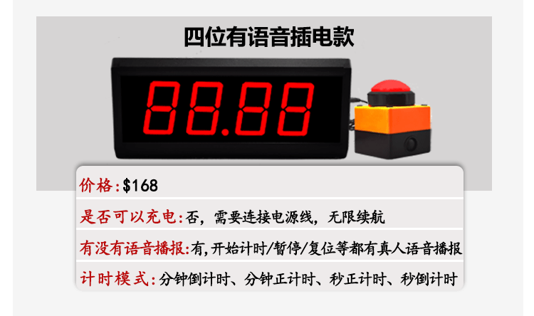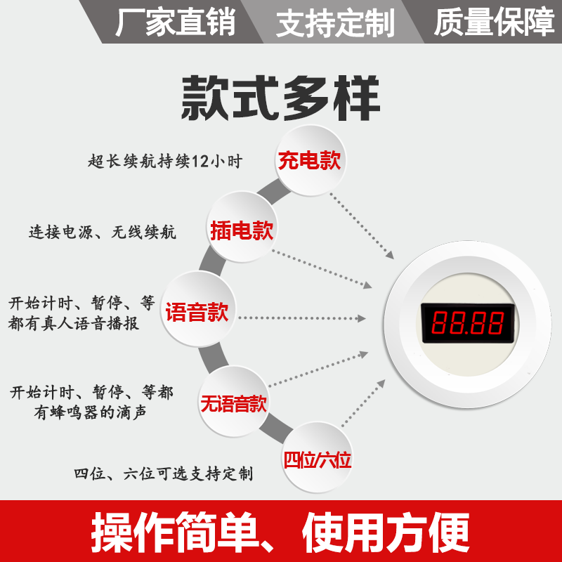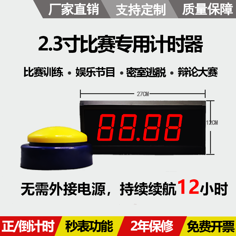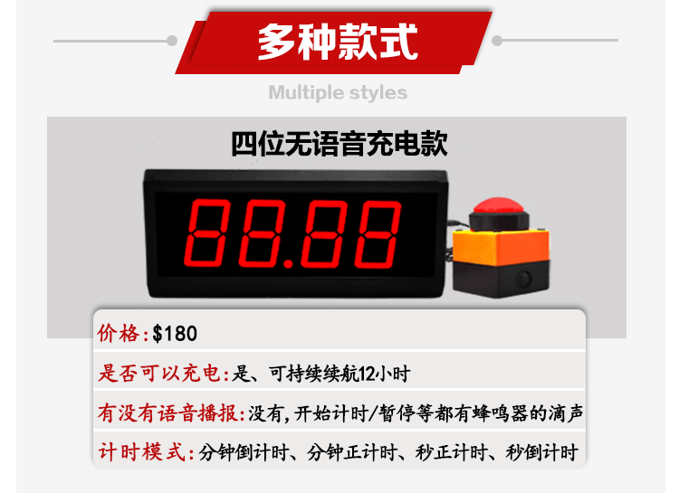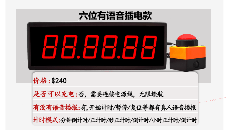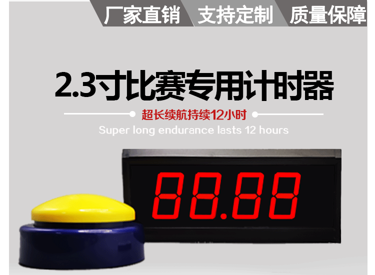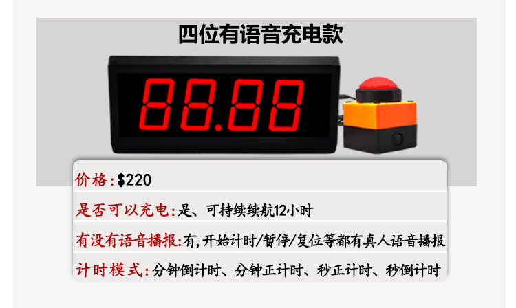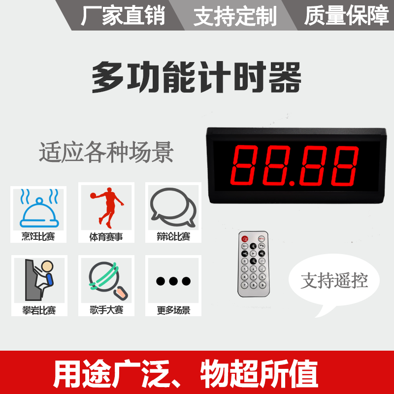 顶伯计时器是我司自行研发、自行生产的新一代智能语音可充电计时器,有四位和六位俩种型号,每种型号均有分钟倒计时、分钟正计时、秒正计时、秒倒计时以及时钟模式,其种六位计时器还增加了小时正计时和小时倒计时模式。操作简单,使用方便。可根据用户个性化需求修改计时器单片机程序及外部硬件样式。计时器可用于演讲比赛,歌手大赛、攀岩、体育赛事、部队训练等各种场合,现已为上万家企事业单位提供了计时保障服务。顶伯计时器,是您比赛计时的不二选择。